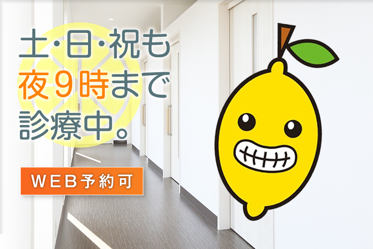 歯のトラブルは、放っておいても治りません。レモン歯科はお仕事や学校でお忙しい方にもご来院しやすいように、平日はもちろん、土曜・日曜、さらに祝日も夜21時まで診療しています。かかりつけの歯科医院が休診の際も気軽にお越しください。